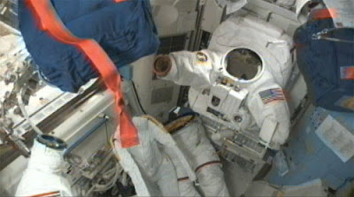 * Notice, the astronauts have small mirrors strapped to their wrists. Presumably to see behind them since you can't really turn your head in a space suit.